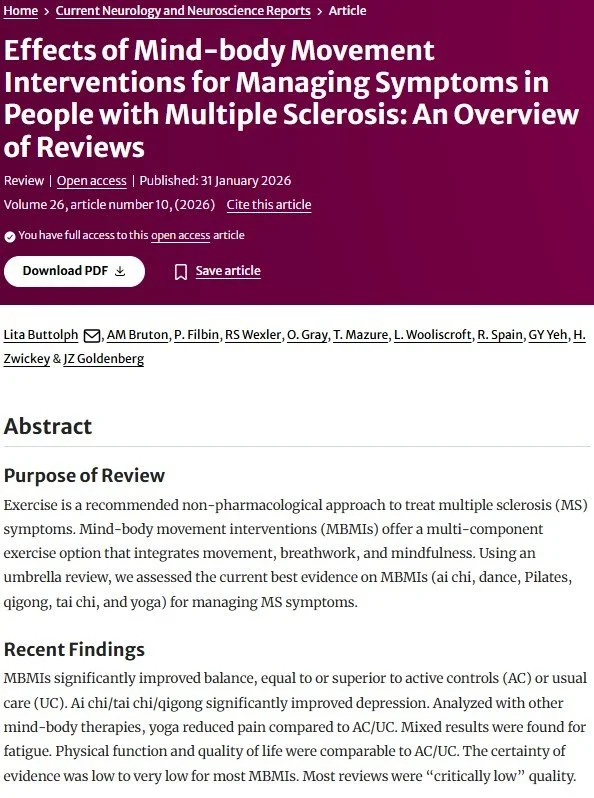 Buttolph L, Bruton AM, Filbin P, Woolicroft L, Spain R, Yeh G, Zwickey H, and Goldenberg J. Movement-based mind-body practices for multiple sclerosis: an overview of reviews. Curr Neurol Neurosci Reports, 2026. https://doi.org/10.1007/s11910-025-01478-8